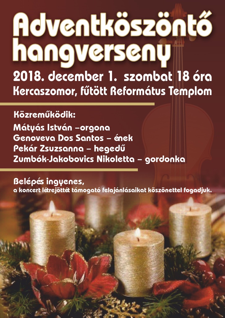Advent 1. vasárnap, 2018. december 2-án 16.00 órától zenés áhítat lesz a Mocsai Református Teplomban.