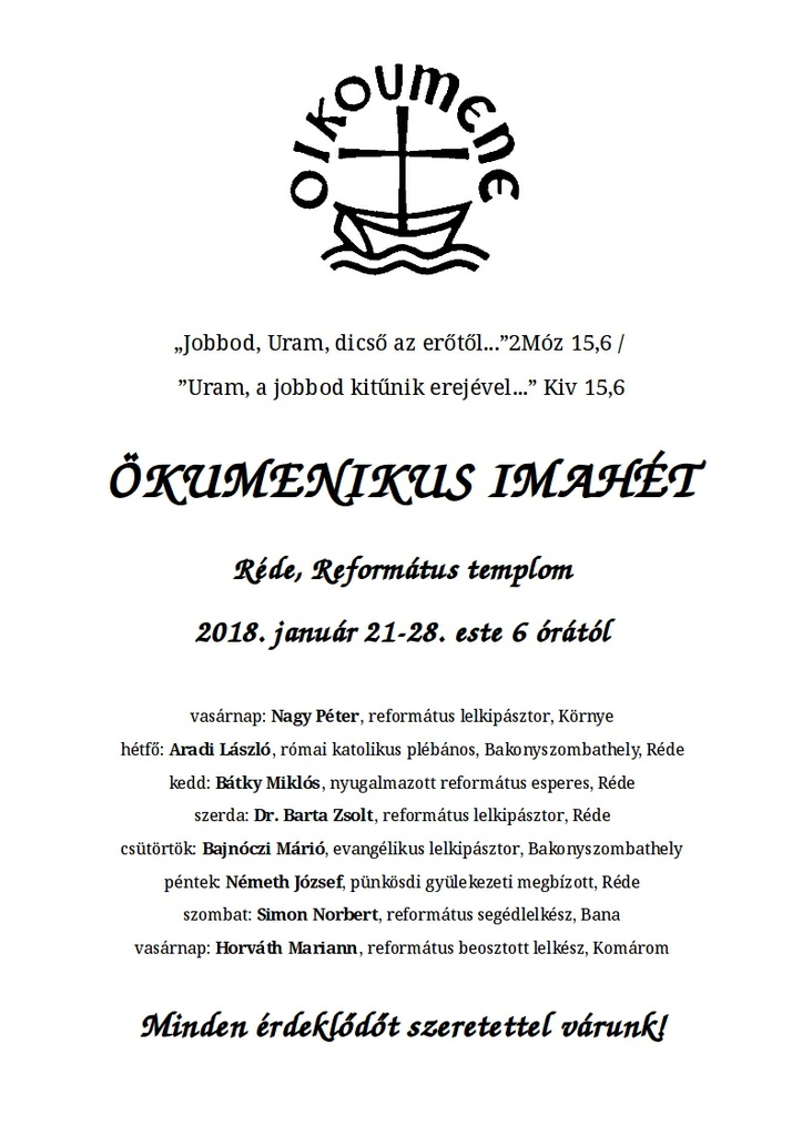 2018-01-24 15:15:53 Adminisztrátor„Jobbod, Uram, dicső az erőtől…” / „Uram, a jobbod kitűnik erejével…” (2Móz/Kiv 15,6) 2018. január 21-28. Minden este 18 órakor