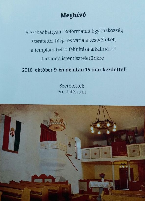 2016. október 9-én (vasárnap) 15 órától hálaadó istentisztelet a templom belső felújításáért Szabadbattyánban