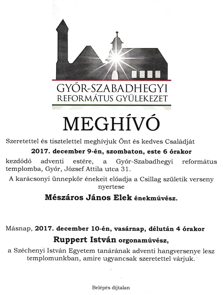 Adminisztrátor, 2017-12-07 08:50:47Szeretettel és tiszteletel hívja az érdeklődőlet a Győr–szabadhegyi református gyülekezet december 9-én és 10-én ünnepi alkalmaira, melyek nemcsak advent jegyében, de a templom 25 éves fennállásának jubileumából is tartatnak.