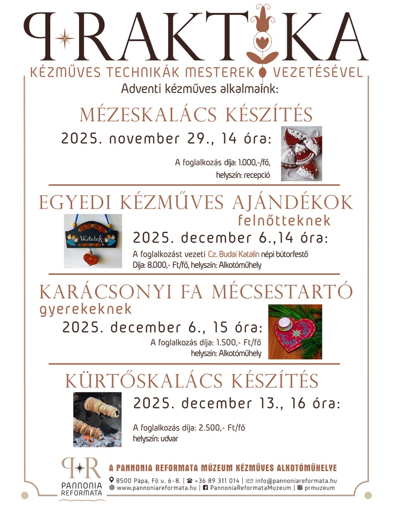 DTRE Kommunikációs Szolgálat, 2025-11-20 07:51:51Közösségi programok, kézműves foglalkozások, koncertek... A Dunántúli Református Egyházkerület Tudományos Gyűjteményei Pannonia Reformata Múzeuma idén is Adventer hangoló programokkal várja vendégeit.