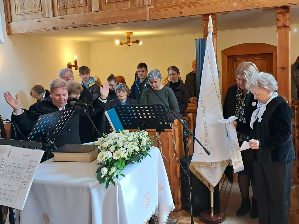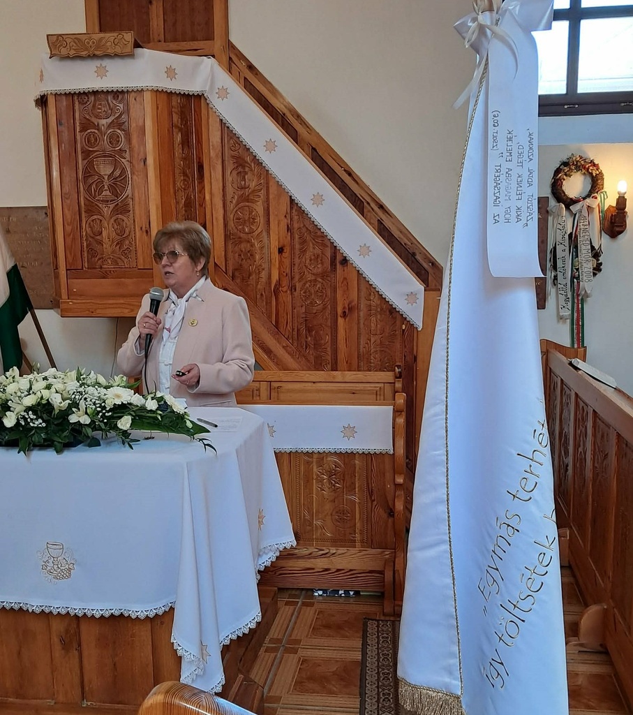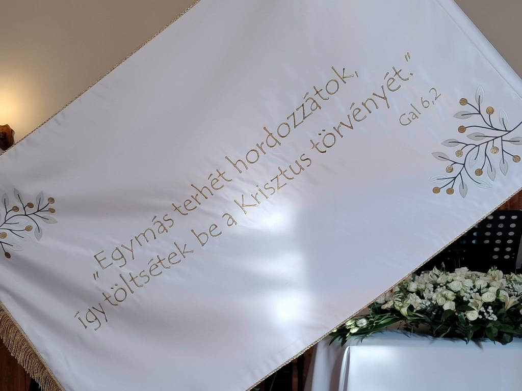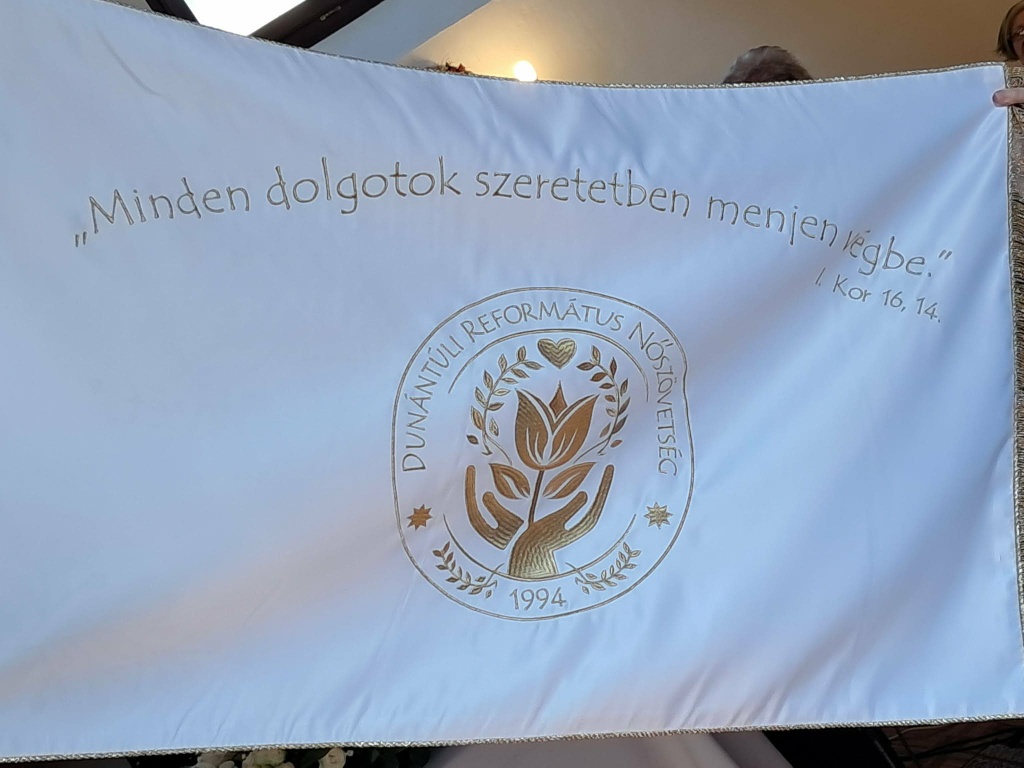 Az igehirdetés után került sor a nőszövetségünk zászlajának bemutatására. Egyik oldalán a Magyarországi Református Nőszövetség jelmondata olvasható, ami több mint 30 év óta jelöli ki a küldetésünket, amit a gyülekezeteinkben, a rászorulók, a nehéz helyzetben élők, a ránk bízottak között végzünk: "Egymás terhét hordozzátok, így töltsétek be a Krisztus törvényét! " Gal 6,2