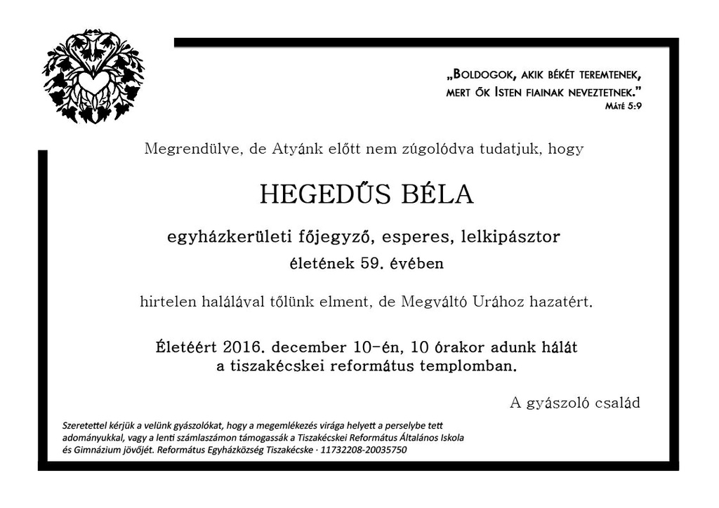 2016. december 10-én szombaton délelőtt 10 órakor adnak hálát Hegedűs Béla életéért a tiszakécskei református templomban.