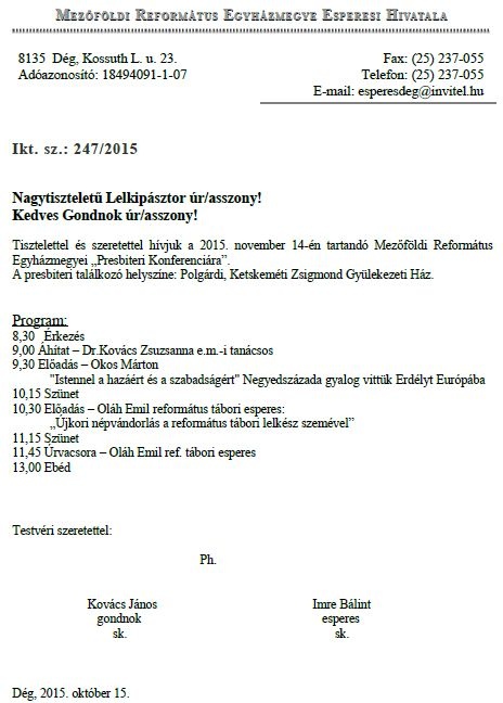 melyet 2015. november 10-én / kedden / 9.00 órai kezdettel tartunk