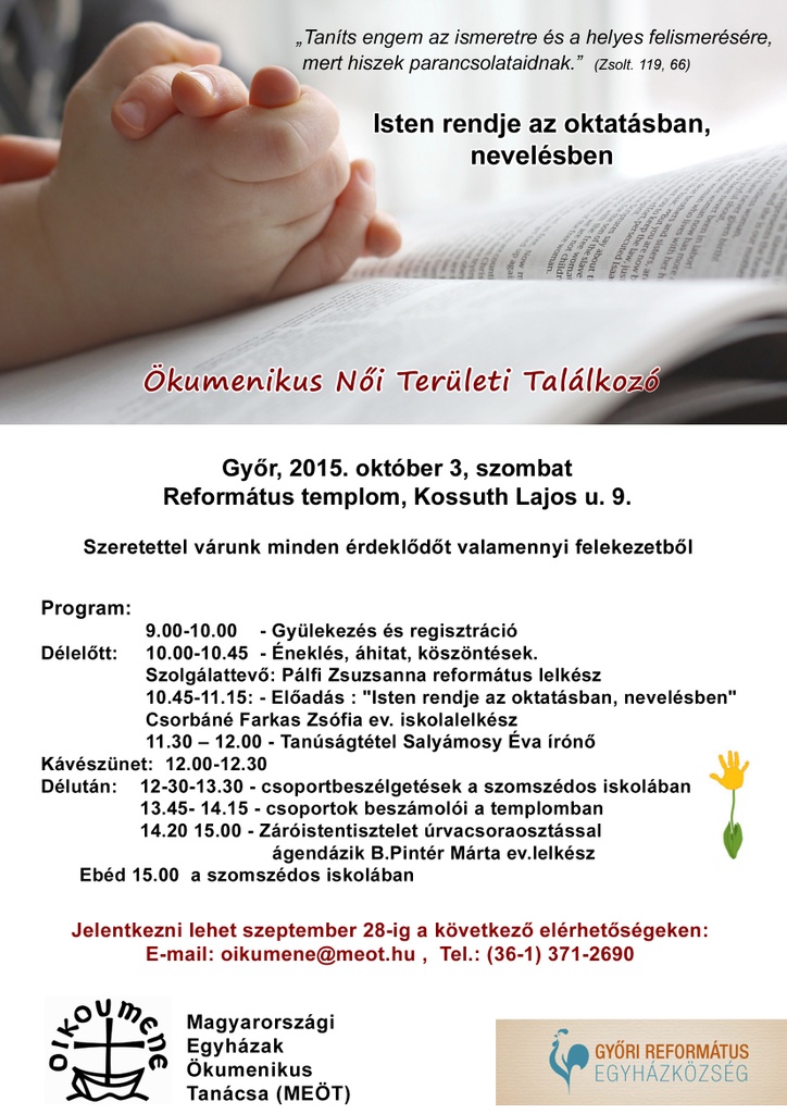 Mindenkit nagy szeretettel hívunk és várunk a MEÖT Női Bizottsága és a Győr Belvárosi Református Gyülekezet és Nőszövetség által szervezett találkozóra. Helyszine a Győr Belvárosi (Kossuth utcai) templom és gyülekezeti ház.