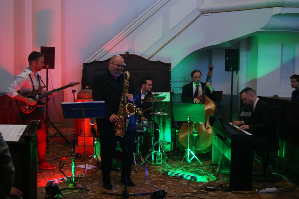 Vidám, zenés időutazáson vehettünk részt a 20-as - 30-as évek Amerikájának swing és dixieland korszakába, Dervalics Róbert és zenekarának „idegenvezetésével”. Az öt kiválóan képzett zenész igényes, hiteles muzsikájával fantasztikus hangulatot teremtett. Dervalics Róbert – „a magyar Louis Armstrong” – hol énekelt, hol szaxofonozott, hol pedig klarinéton játszva kápráztatta el a hálás, művészetet értő közönséget. A zongoránál – iskolánk egykori tanára – Potesz Tamás ült, virtuozitását újfent bizonyítva. Zongoraszólóit többször viharos taps kísérte. A gitáros „szerepében” Szerepi Dávidot láthattuk. Kebuszek Zsolt ütőhangszerekkel adta a ritmust, míg Nagy Ferenc nagybőgővel játszva tette kerek egésszé az igényes muzsikát. A koncert alatt többször, majd a végén is vastapssal köszöntük meg a zenészek szórakoztató előadását. Louis Armstrong Istent dicsőítő dallamaiból több is elhangzott a műsor részeként.