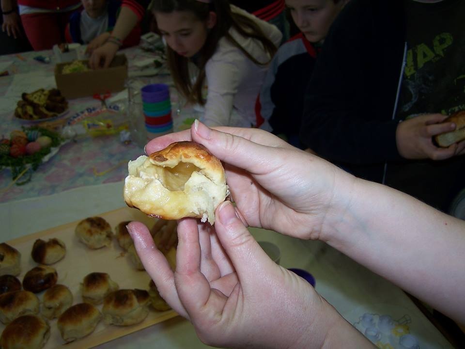 A gyerekek és néhány szülő zsúfolásig megtöltötték a gyülekezeti termet és az udvart. Először feltámadás bucit sütöttünk. Az előző este bedagasztott tésztát kinyújtottuk és annyi kockára vágtuk, ahányan voltunk. Ez jelképezte Jézus halotti leplét, amibe betekertük Jézus testét, amit pedig egy fehér pillecukor jelképezett. Ezt előtte belemártottuk olvasztott vajba, majd fűszereket kentünk rá (fahéjas cukor) utalva arra, hogy milyenek voltak az akkori temetkezési szokások Izraelben. Végül gombóccá gyúrtuk a tésztát, tojással kentük meg és betettük a forró sütőbe sülni.