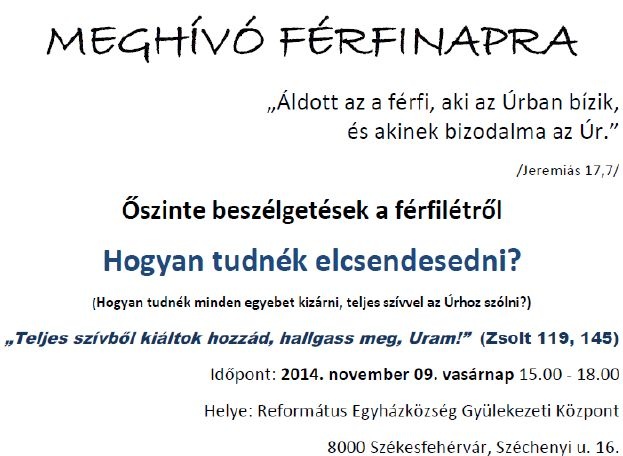 Minden érdeklődő férfitársunkat várjuk szeretettel a férfinapi alkalomra. A találkozás során reménység szerint férfitestvérek útkeresését, nehézségeit, küzdelmeit, hálaadását élhetjük át, és kiscsoportos beszélgetésekben megoszthatjuk saját tapasztalatainkat. Nagy cicoma nem várható, csak az Úr Jézus Krisztusra szeretnénk figyelni.