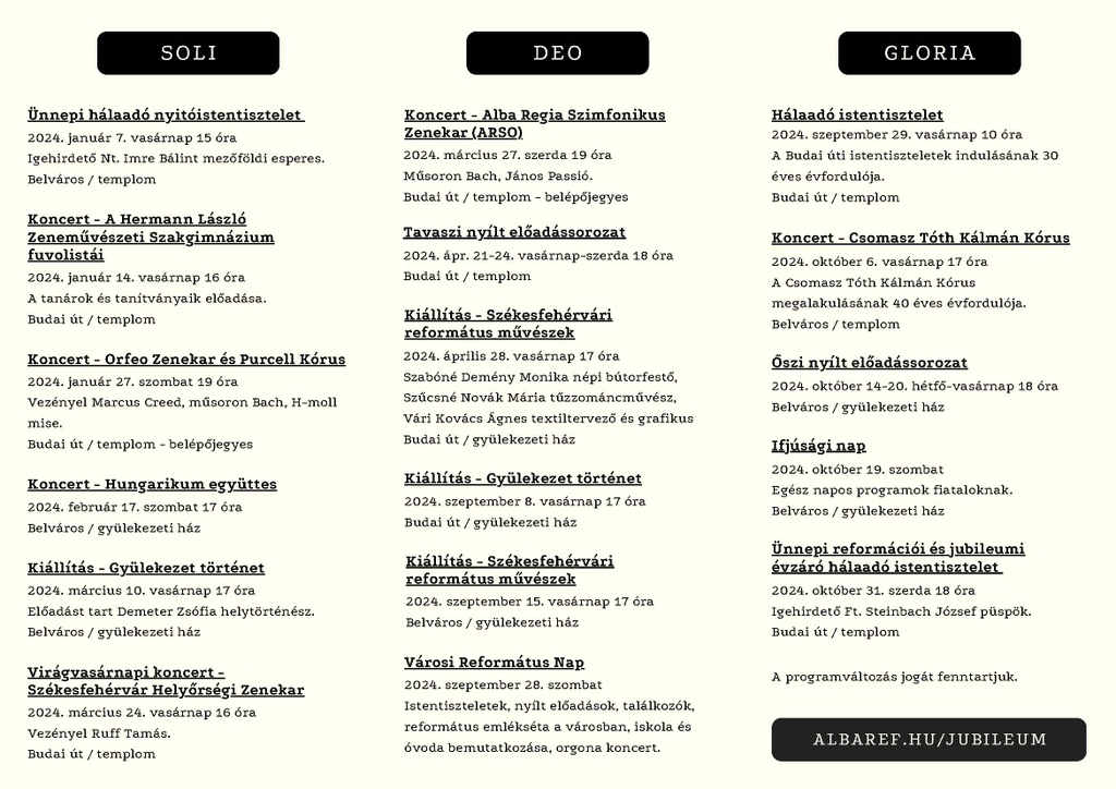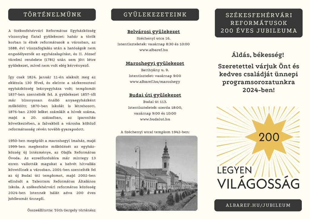 Ünnepi, hálaadó istentisztelettel kezdődött vasárnap a Székesfehérvári Református Egyházközség jubileumi éve. Az első helyi református gyülekezet megalakulásának évfordulója alkalmából egész éves programsorozattal, a többi között koncertekkel, kiállításokkal előadás-sorozattal készülnek.