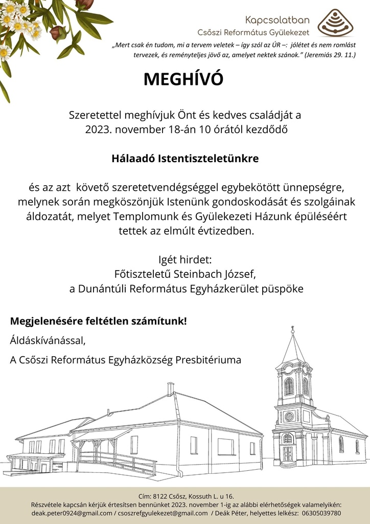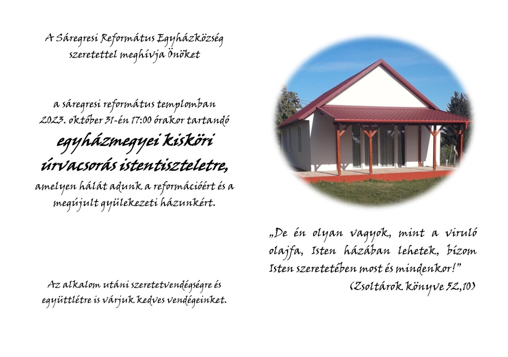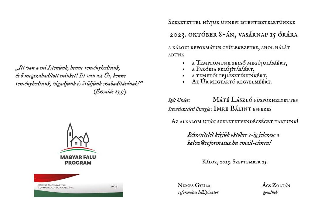 Hálaadásra gyűltek október nyolcadikán a kálozi reformátusok. Az Úrnak mondtak köszönetet az elmúlt öt évben megújult épületeikért. A hálaadó alkalmon Máté László egyházkerületi lelkészi főjegyző az Istenbe vetett reménység szabadító erejét hirdette: „A mai ünnep egy jel a későbbiekre nézve, arra, hogy Istennek terve van velünk, éljen bennünk a remény, hogy ígérete szerint megszabadít bennünket. Bízzuk Őrá dolgainkat, gondjainkat, mert Ő nem engedi, hogy ne érkezzünk meg Őhozzá".