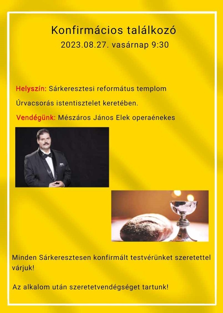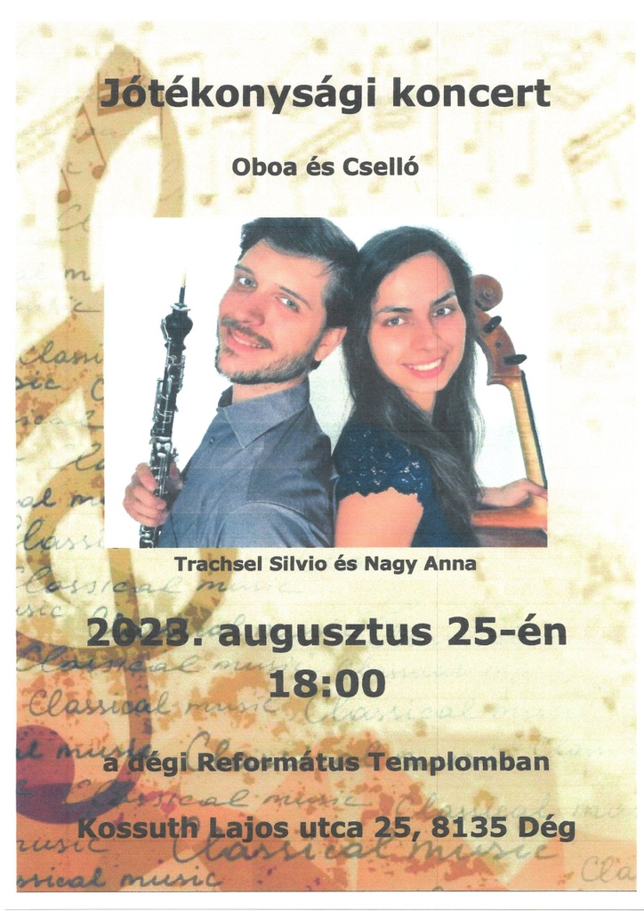 Szeretettel hívjuk és várjuk a dégi református templomba Trachsel Silvio és Nagy Anna zeneművészek jótékonysági koncertjére 2023. augusztus 25-én 18 órai kezdettel.