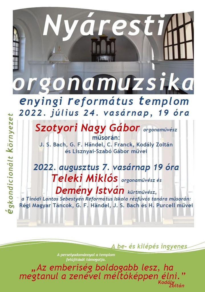 Nyáresti orgonamuzsika koncertekre július 24-én és augusztus 7-én vasárnap este 7 órakor.