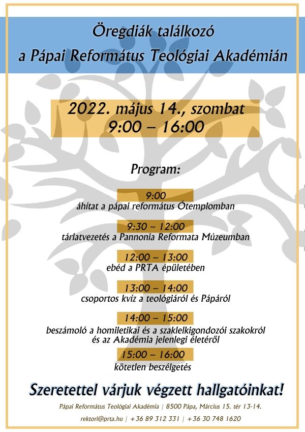A Pápai Református Teológiai Akadémia szeretettel várja öregdiákjait családtagjaikkal együtt 2022. május 14-én, szombaton öregdiák találkozóra. Részvételi szándékukról legkésőbb 2022. május 6-ig értesítsék a Rektori Hivatalt!