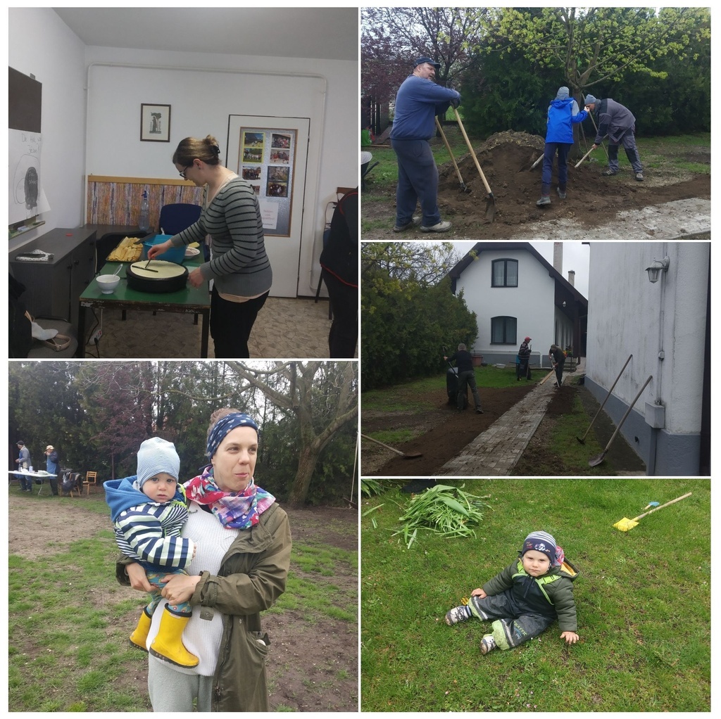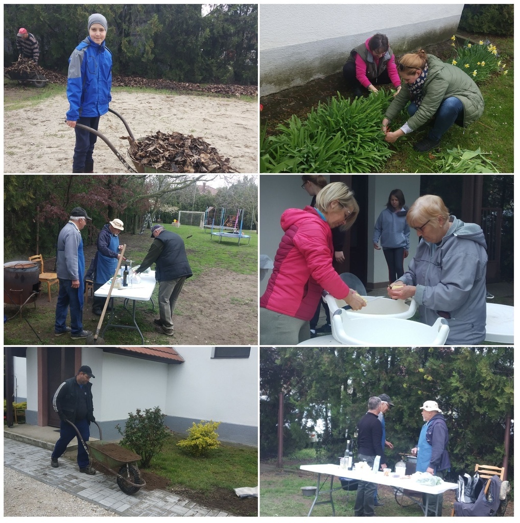Készültek a zsíros kenyerek hagymával és az óriáspalacsinták, illetve a szarvaspörkölt, amelynek az előkészítése már előző nap megkezdődött. Természetesen volt sütizés és pogácsázás is, illetve a szomjunkat is oltottuk. Majd következett a körülbelül öt köbméter föld elterítése, templomkertrendezés, a talaj előkészítése, hengerezés, fűmagvetés, rózsaültetés, lehullott falevelek, száraz ágak összegyűjtése. Magvalósult még a templomtakarítás, a virágoskert rendezése, trambulin összeszerelése, muskátlik elültetése. Előkerült a sok-sok játék, melyeket gondos kezek megtisztítottak, és megtörtént a focipályára belógó diófaágak lefűrészelése is. Nem maradt el természetesen a gyülekezeti ház takarítása sem, sőt még új kerti kapu is készült a templomkertben, és még sorolhatnánk mi minden történt, játék, főzés, imádság, beszélgetések, együtt a szeretetben. Ami két-három embernek 1-2 heti munka lett volna, az 25-30 Testvér segítségével belefért egy szombati napba. Idősek és fiatalok, felnőttek és gyerekek. Nagyon jó volt együtt lenni!