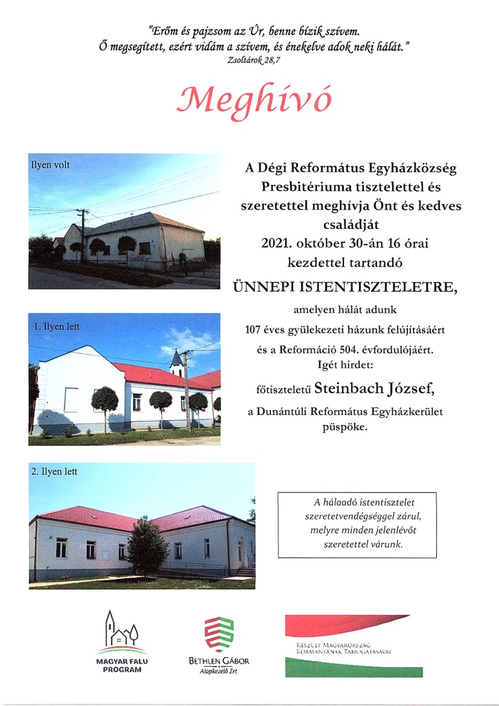 Tavaly május óta tervezett ünnepi alkalmat tarthattak meg Dégen. Istentisztelet keretében adtak hálát az Úrnak a megújult gyülekezeti házért, a helyi református közösségért. Az október 30-án megtartott alkalmon Steinbach József püspök igehirdetésében megemlékezett a reformáció 504 éves jubileumáról is.