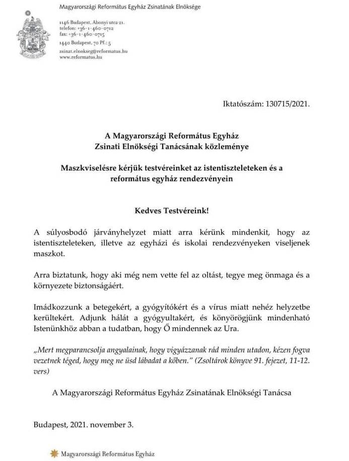A súlyosbodó járványhelyzet miatt arra kérünk mindenkit, hogy az istentiszteleteken, illetve az egyházi és iskolai rendezvényeken viseljenek maszkot.