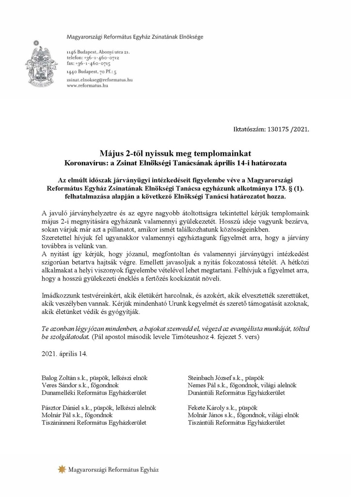 A Mezőföldi Református Egyházmegye lelkipásztorainak, gondnokainak, presbitereinek, gyülekezeteinkben élő testvéreinknek és minden olvasónak Krisztus szabadító és megtartó kegyelmében gazdag Mennybemenetel ünnepet kívánunk.