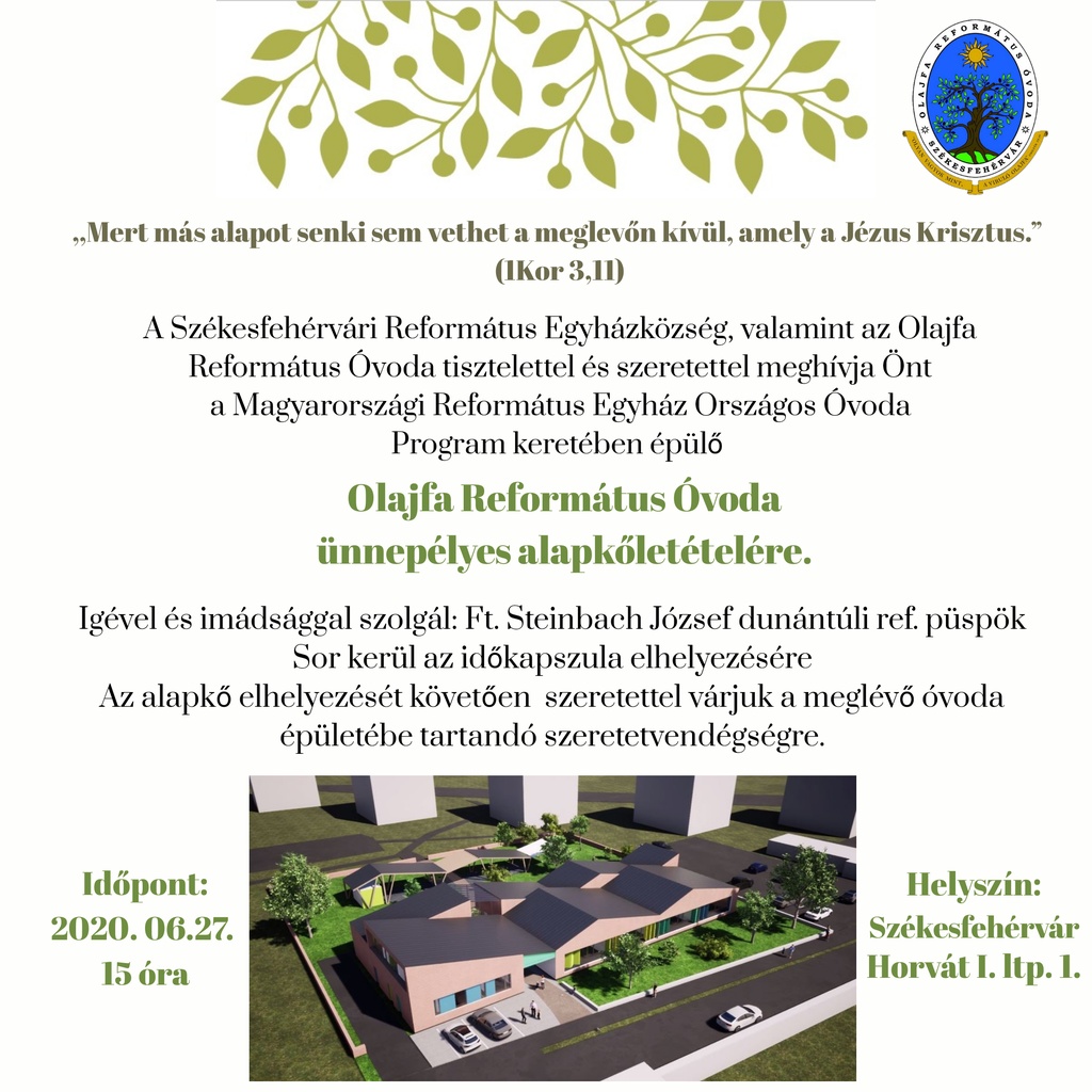 A Magyar Református Egyház Országos Óvoda Programja keretében hatvanhat intézmény épül, illetve újul meg a 2021-2022-es nevelési évre. A programban megépül az új Olajfa Református Óvoda is, melynek alapkövét szombaton tették le. A fejlesztésnek köszönhetően az intézmény mintegy 680 négyzetméteren, 100 gyerek számára biztosít majd óvodai férőhelyet.