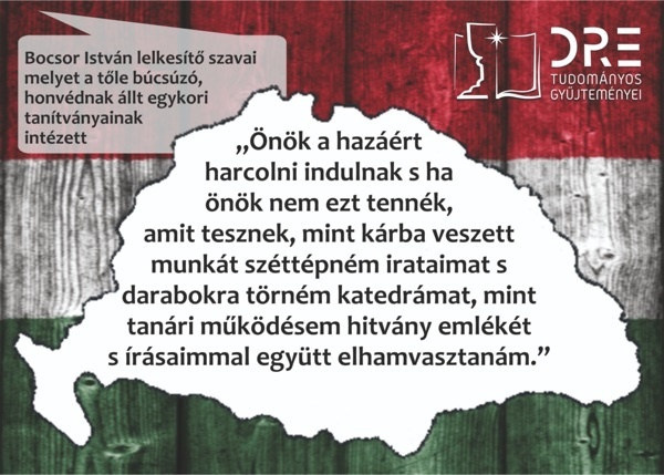 A kiállításon látható a fenti kép, amelyen Bocsor Istvánnak, a Pápai Református Kollégium történelemtanárának híres, ma is megindító mondata olvasható, amellyel harcba küldte diákjait.