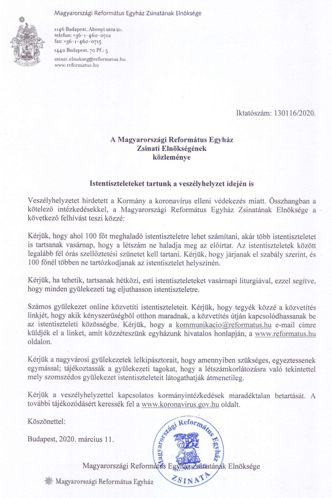 A koronavírus gyors terjedése miatt hozott kormányzati intézkedésekkel összhangban a Magyarországi Református Egyház elnöksége a következő kéréssel fordul a gyülekezetek, lelkipásztorok és egyháztagok felé.