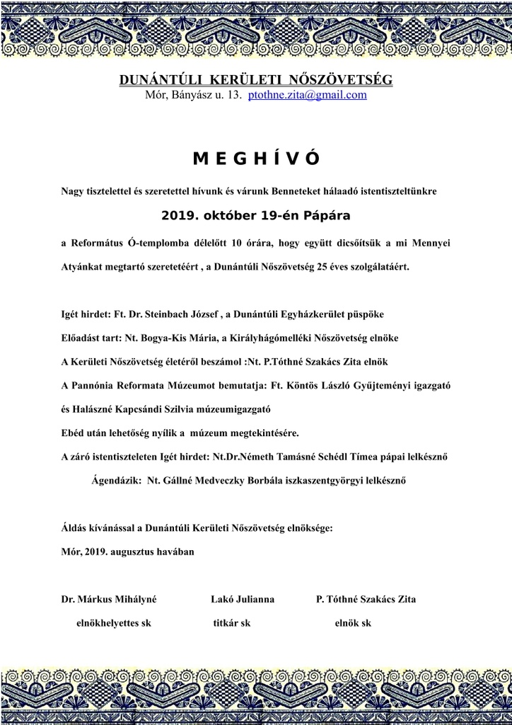 A Dunántúli Kerületi Nőszövetség meghívója Hálaadó Istentiszteletükre, amely 2019. október 19-én lesz Pápán.