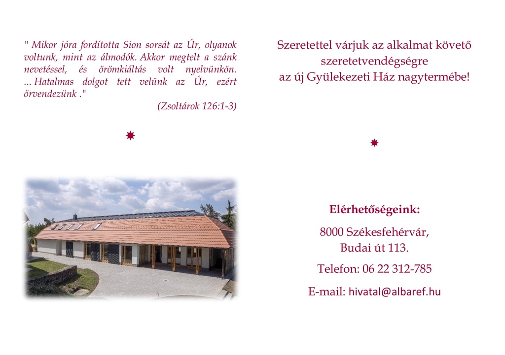Szeretettel várjuk az elcsendesedni vágyódókat és az egyházunkért Isten elé járulni szándékozókat!"