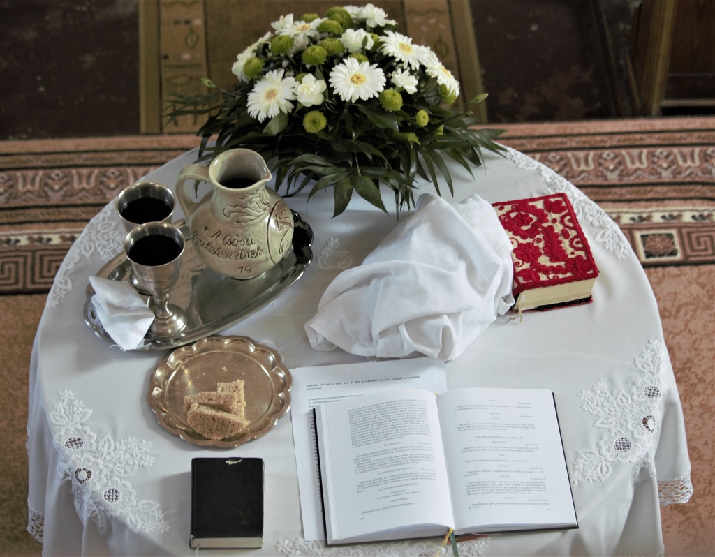 (A képen a csőszi református templom ünnepi úrasztala látható.)