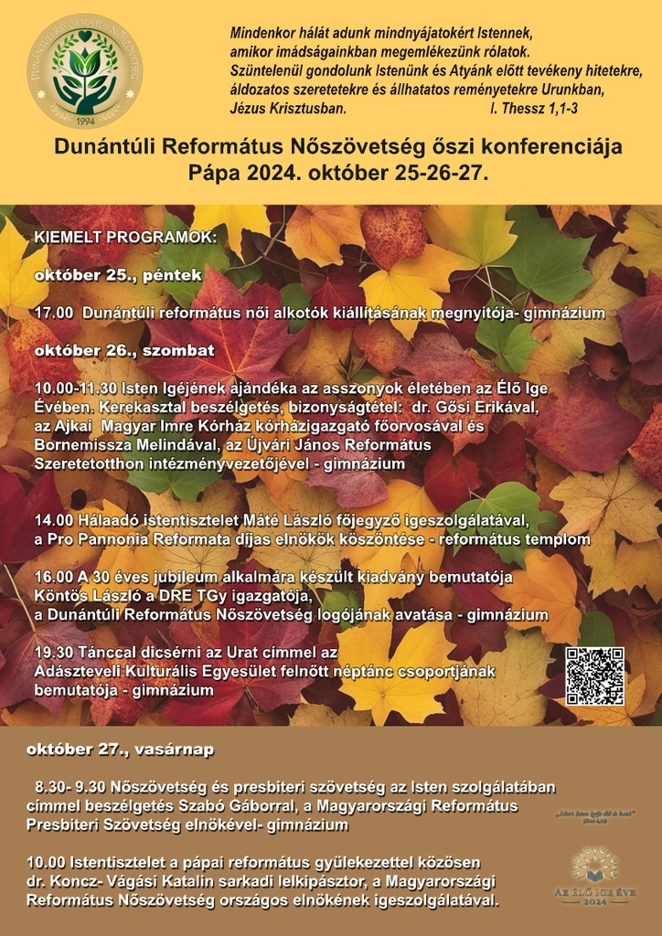 Azt gondolom, sokak nevében írhatom, hogy évről évre nagy várakozással tekintünk a Mezőföldi Református Egyházmegyei Női Konferencia elé, amelynek idén is a Székesfehérvár Budai Úti Református Egyházközség adott otthont 2024. október 12-én, szombaton. Az alkalom vendége Prof. Dr. Bagdy Emőke volt, aki A hit szerepe és rendeltetése az életünkben címmel tartott igazán értékes előadást lenyűgöző, lendületes stílusában.