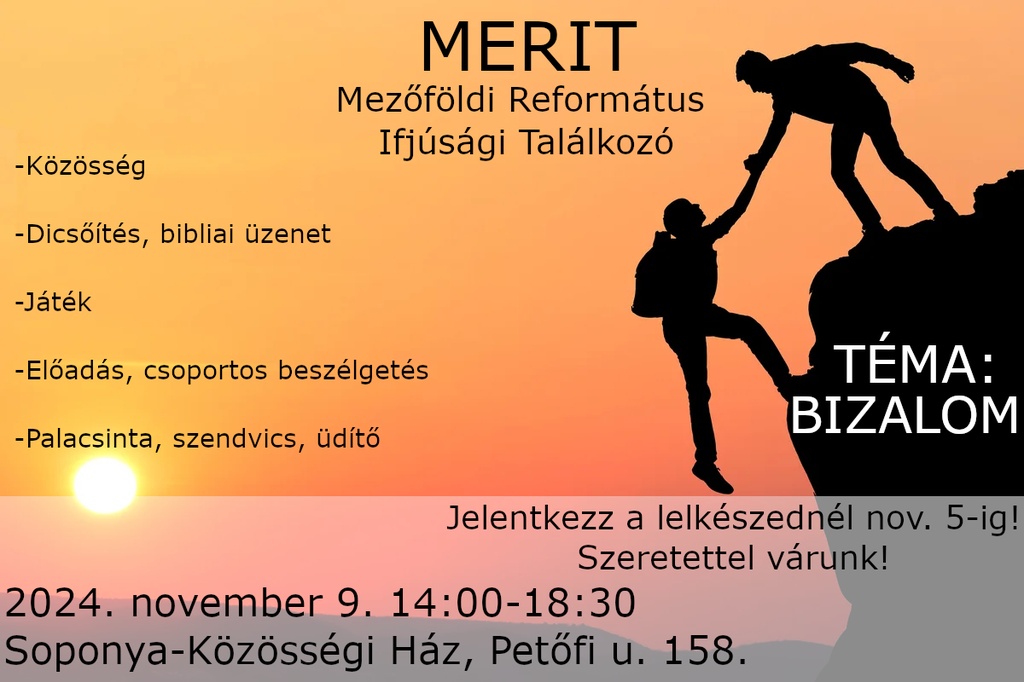 2024. november 9-én szombaton délután a soponyai közösségi házba a mezőföldi református gyülekezetekek ifjai érkeztek, több mint nyolcvanan. A házigazda soponyai fiatalok mellett Dégről, Fehérvárcsurgóról, Iszkaszentgyörgyről, Kislángról, Kálozról, Lajoskomáromból, Magyaralmásról, Mátyásdombról, Polgárdiból, Székesfehérvárról, Sáregresről jöttek fiatalok. A találkozója témája a bizalom volt.