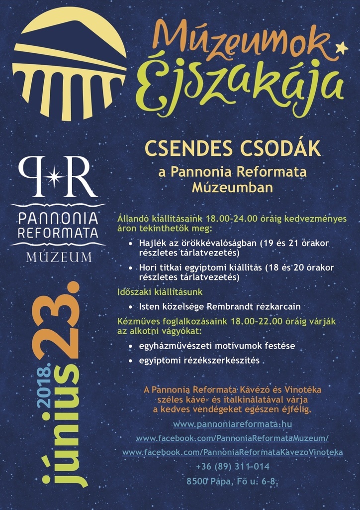 A Múzeumok Éjszakáján a Pannonia Reformata Múzeumban az állandó kiállítások 18:00-24:00 között kedvezményes áron tekinthetők meg.