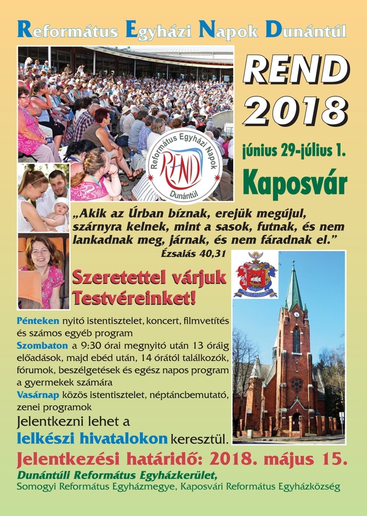 Nyolcadik alkalommal kerül megrendezésre 2018. június 29 - július 1. között a Református Egyházi Napok Dunántúl fesztivál. A dunántúli reformátusság találkozójára idén Kaposváron kerül sor. A lelkészi hivatalokban már megtalálhatók a tájékoztatók és jelentkezési lapok, már lehet jelentkezni a fesztiválra.