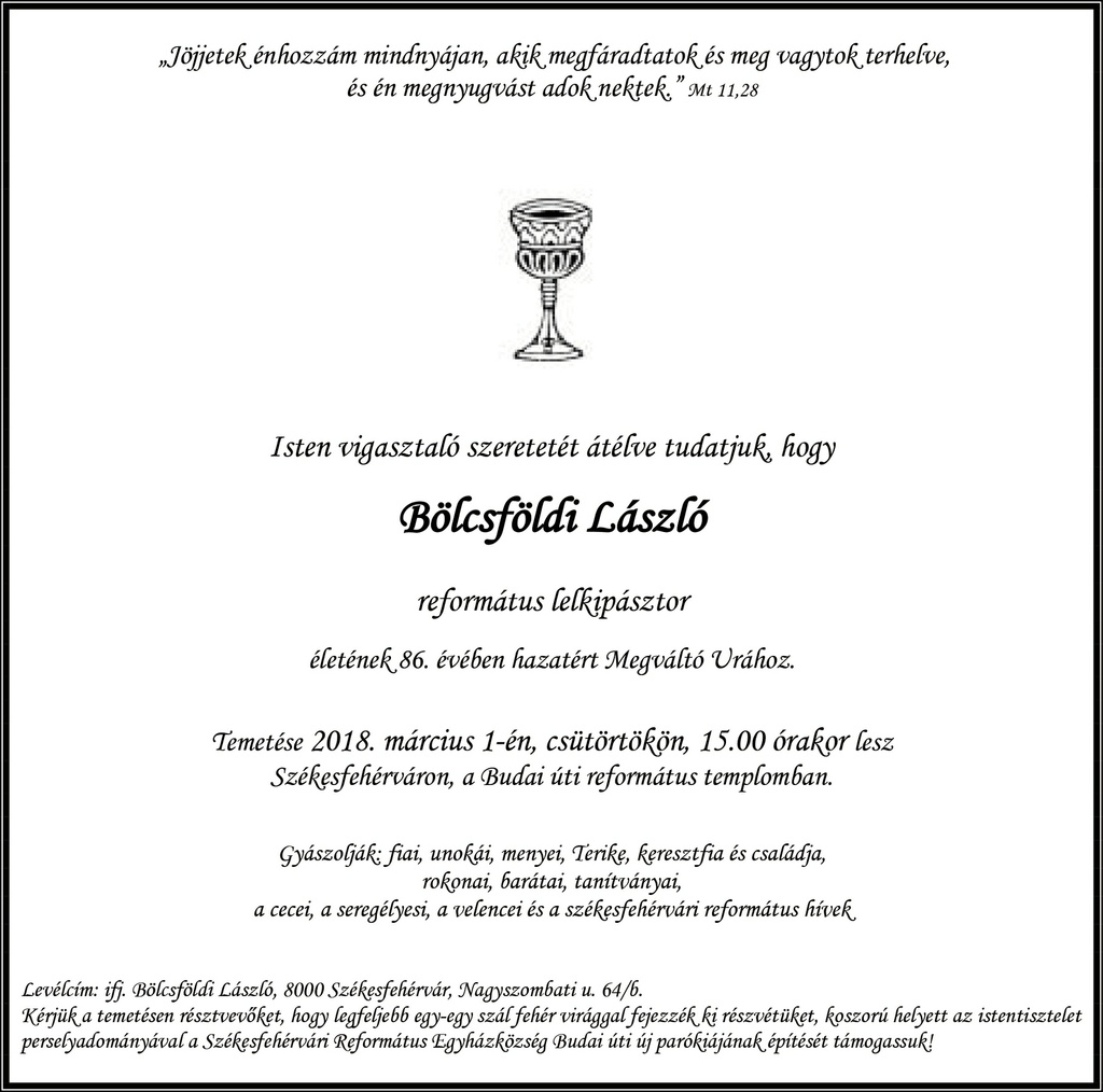 Isten vigasztaló szeretetét átélve tudatjuk, hogy Bölcsföldi László református lelkipásztor életének 86. évében hazatért Megváltó Urához.