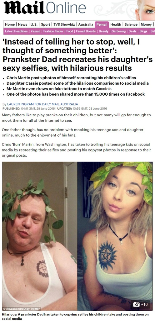 Június 28-án megjelent egy hír a Daily Mail-ben, amely szerint egy apuka megelégelte lánya szelfimániáját, és radikális lépésre szánta el magát. A cikk szerint „időt és fáradságot nem kímélve lekopizta” a lánya fotóit: ugyanolyan ruhát vett el, ugyanúgy pózolt, még a lánya sminkjét, frizuráját és tetkóit is lemásolta, és így készített magáról egy szelfisorozatot. A lánya eredeti szelfijét a saját fotója mellé vágta, és ezeket a képpárokat megosztotta a saját internetes oldalán. A fotókat gyorsan felkapta az internetes média, néhány órán belül több mint tízezren osztották meg a vicces kedvű „trollpapa” fotóit.