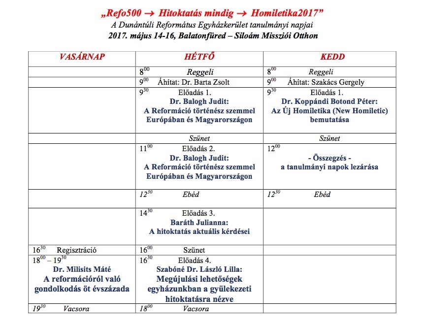 A konferenciára 2017. május 14-16 (vasárnap este – kedd délután) között kerül sor Balatonfüreden, a Siloám Missziói Otthonban a csatolmányban olvasható programtervezet szerint.