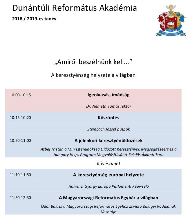 Előadónk lesz Azbej Tristan államtitkár, Miniszterelnökség Üldözött Keresztények Megsegítéséért és a Hungary Helps Program Megvalósításáért Felelős Államtitkárság vezetője, aki a jelenkori keresztyénüldözésről, Hölvényi György európa parlamenti képviselő a keresztyénség európai helyzetéről, Ódor Balázs a Magyarországi Református Egyház Külügyi Irodájának vezetője a Magyarországi Református Egyház nemzetközi kapcsolatairól tart előadást.