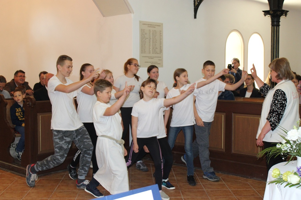 A délelőttöt istentisztelettel kezdtük, amelyen a soponyai és a kislángi gyülekezeti tagok is résztvettek. Isten Igéjét Fazekas Zsuzsanna révkomáromi lelkipásztor hirdette. Ez az alkalom tanévzáró istentisztelet volt, amelyen a gyermekek az óvodásoktól a konfirmandusokig aktívan közreműködtek. Az igehirdetésben nagytiszteletű asszony személyes, meleg hangvétellel beszélt, gyermek- és családközpontú gondolatai megérintették a kicsiket és a nagyokat is. A gyermek-istentisztelet csapata Kissné Király Éva vezetésével egy jelenetet mutatott be Péter és Jézus életéről a nagycsütörtöki eseményekre fókuszálva, nagypéntek és húsvét üzenetét hangsúlyozva. Az istentiszteletet meghittebbé tette Kovács Tamara (Kisláng) éneke és Balogh Orsolya (Mátyásdomb) szavalata.