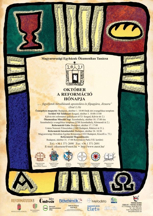 Október a reformáció hónapja. A Magyarországi Egyházak Ökumenikus Tanácsa szervezésében országszerte programokra kerül sor. Az ünnepélyes megnyitó október 1-jén a Deák téri evangélikus templomban lesz, igét hirdet Steinbach József püspök. Október 10-én Szombathelyi Ökumenikus Missziói Nap, október 17-én vasárnap az Uránia Nemzeti Filmszínházban Reformáció Gálaestet tartanak. 24-én Úrvacsorás istentisztelet keretében adnak hálát a reformációért a Magyarországi Metodista Egyház Központjában, majd október 31-én a Reformáció Parkban lesz az ünnepi reformációi megemlékezés. A részletes programokról a MEÖT honlapján tájékozódhatnak.