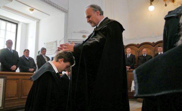 Máté László egyházkerületi lelkészi főjegyző vezetésével esküt tettek a felszentelés előtt álló lelkészek, majd térdre ereszkedve kapták meg az áldást életükre és szolgálataikra az espereseiktől.