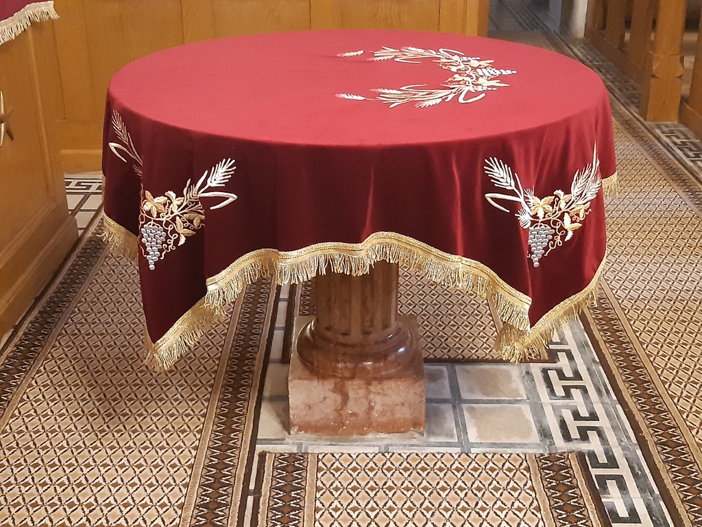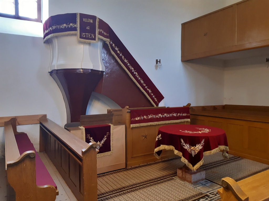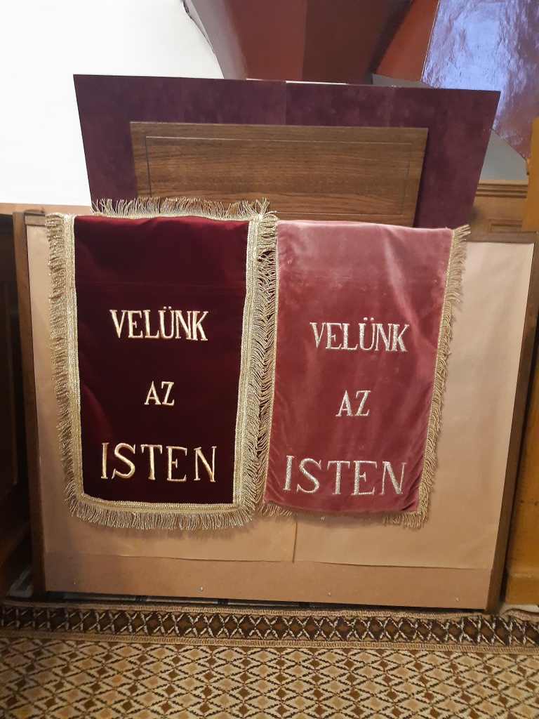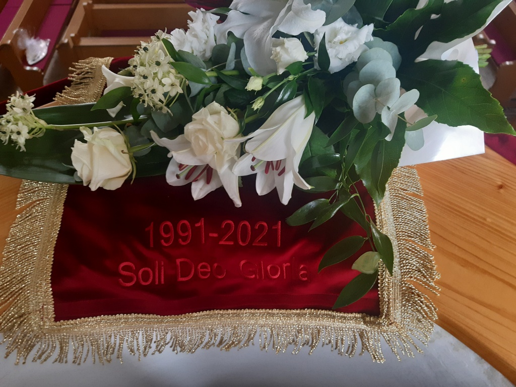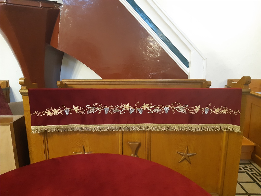 A lelkészcsalád Isten iránti háláját - az ajándékba kapott áldott esztendőkért, évtizedekért - a gyülekezet iránti köszönetét - a befogadó, elfogadó és a 30 esztendőn át kitartó szeretetéért - hirdeti a templomban ez ünnepélyes alkalomra készíttetett úrasztala- és szószék terítő garnitúra.