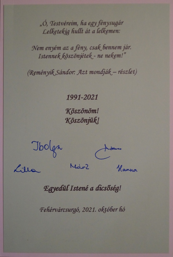 2021. október 17-én hálaadó istentisztelet keretében köszöntöttük a Fehérvárcsurgói Református Egyházközségben végzett szolgálatának 30. évfordulója alkalmából lelkipásztorunkat, Jákob Judit Ibolya nagytiszteletű asszonyt és kedves családját.