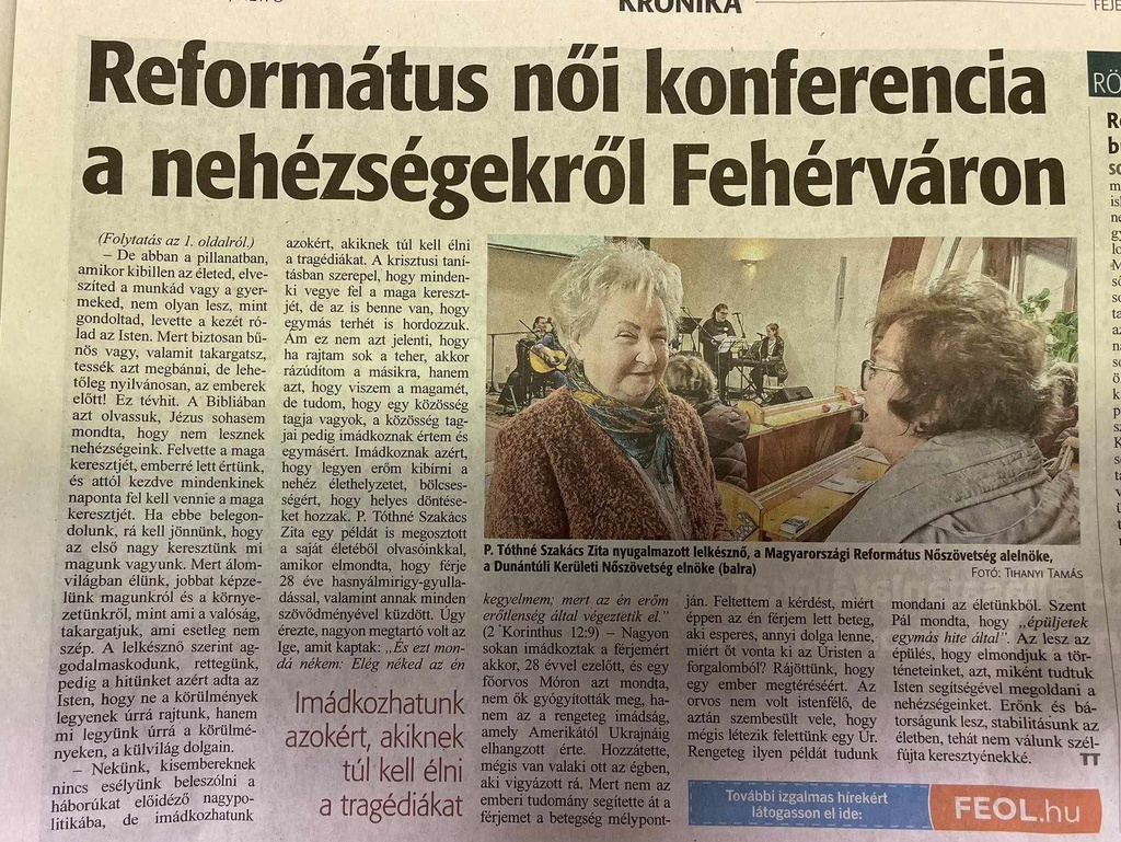 P. Tóthné Szakács Zita egy példát is megosztott a saját életéből a FEOL olvasóival, amikor elmondta, hogy férje 28 éve hasnyálmirigy gyulladással, valamint annak minden szövődményével küzdött. Úgy érezte, nagyon megtartó volt az Ige, amit kaptak: „És ezt mondá nékem: Elég néked az én kegyelmem; mert az én erőm erőtlenség által végeztetik el." (2 Korinthus 12:9)