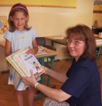 Cikkindító képünkön fiatalok kapják meg könyveiket, balról jobbra: Máté Eszter (2.osztály), Laki Zita tanárnő- osztályfőnök, Nagy Dávid (1. osztály), és Nagy Noémi (4.osztály) Alsó képünkön az első osztályos Hellinger Éva ismerkedik új tanárnőjével, Laki Zitával és természetesen leendő tankönyveivel.