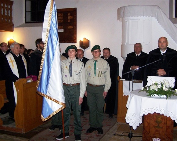 Káloz - Az egyházközség címerét és zászlaját Szelesné Csizmadia Márta iparművész tervezte és készítette el - az első szalagot is ő kötötte fel. A zászlót cserkészek őrizték.