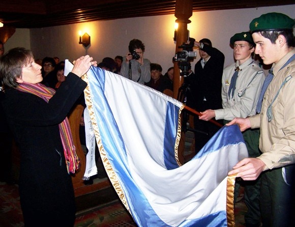 A zászlóra Szelesné Csizmadia Márta iparművész kötött szalagot