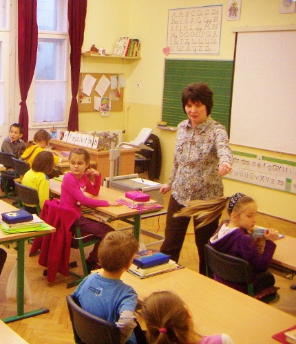 (Interjúnk alsó képén az igazgatónő elsősök körében látható, az iskola novemberi nyílt tanítási napján)