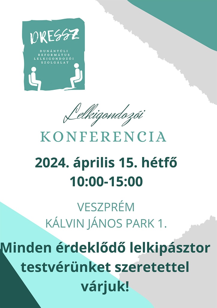 A Dunántúli Református Lelkigondozói Szolgálat (DRESSZ) konferenciát tart Veszprémben április 15-én. A konferencia előadói Mucsi Zsófia a Gyökössy Intézet szakmai igazgatója és Fekete Márton a galyatetői Imádság Házának vezetője lesznek. A részvétel ingyenes, de regisztrációhoz kötött.