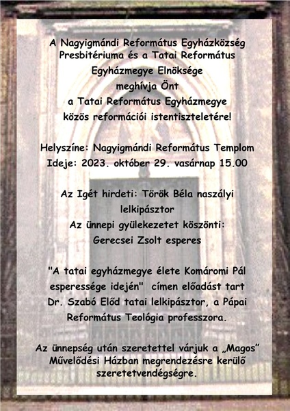 2023. november 25-én a Tatai Ref. Egyházmegyével közösen szeretnék az alkalmat megrendezni, hogy az egyházmegyében lévő szolgálók is kaphassanak segítséget a Krisztus test, az egyház építésében.