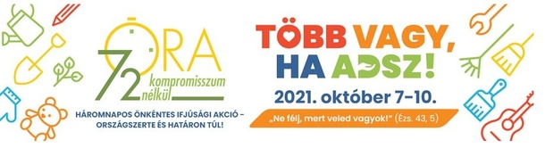14. alkalommal rendezi meg a három történelmi keresztény egyház a 72 óra kompromisszum nélkül háromnapos önkéntes, ifjúsági akciót 2021. október 8-10. között. Az akció évről évre több ezer magyarországi és a határon túli magyar fiatal számára teszi lehetővé, hogy kipróbálhassák az önkénteskedést!A 72 óra honlapján már elindult a regisztráció és szeptember 10-ig várják a koordinátorok jelentkezését is!