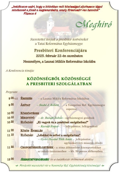 A Tatai Ref. Egyházmegye következő lelkészértekezlete 2025. február 10-én hétfőn du. 16.00-tól lesz Dunaalmáson a megújult Gyülekezeti Házban (Dunaalmás, Almási u. 70)