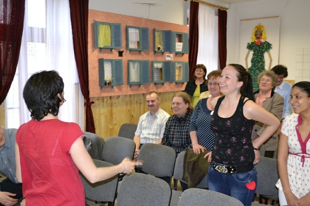 Az előadás kezdete előtt egy kis gyakorlati bemutatót tartott előadónk és humoros, közös énekkel mozgatta meg a résztvevőket